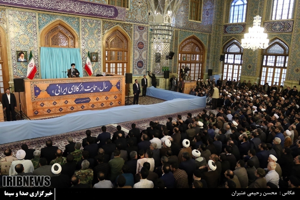 به گزارش خبرگزاری صدا و سیما به نقل از پایگاه اطلاعرسانی دفتر مقام معظم رهبری، حضرت آیت الله خامنه ای، رهبر معظم انقلاب اسلامی عصر امروز (چهارشنبه) در اجتماع عظیم زائران و مجاوران حرم مطهر رضوی در رواق امام خمینی و صحنهای اطراف حرم، با اشاره به استحکام و نشاط انقلاب در چهل سالگی و خنثی شدن نقشه شوم امریکاییها برای منطقه، به تبیین چرایی، الزامات و راههای تحقق شعار سال یعنی حمایت از کالای ایرانی پرداختند و با تأکید بر «قابل حل بودن همه مشکلات با نگاه به داخل» و نیز ضرورت توجه و به کارگیری هر چه بیشتر جوانان در میدانهای مختلف از جمله عرصههای مدیریتی افزودند: نسل جوان و پرافتخار این سرزمین، پرچم استقلال، عزت، عظمت و شرافت ایران را بلندتر از هر زمان دیگر به اهتزاز درخواهد آورد.