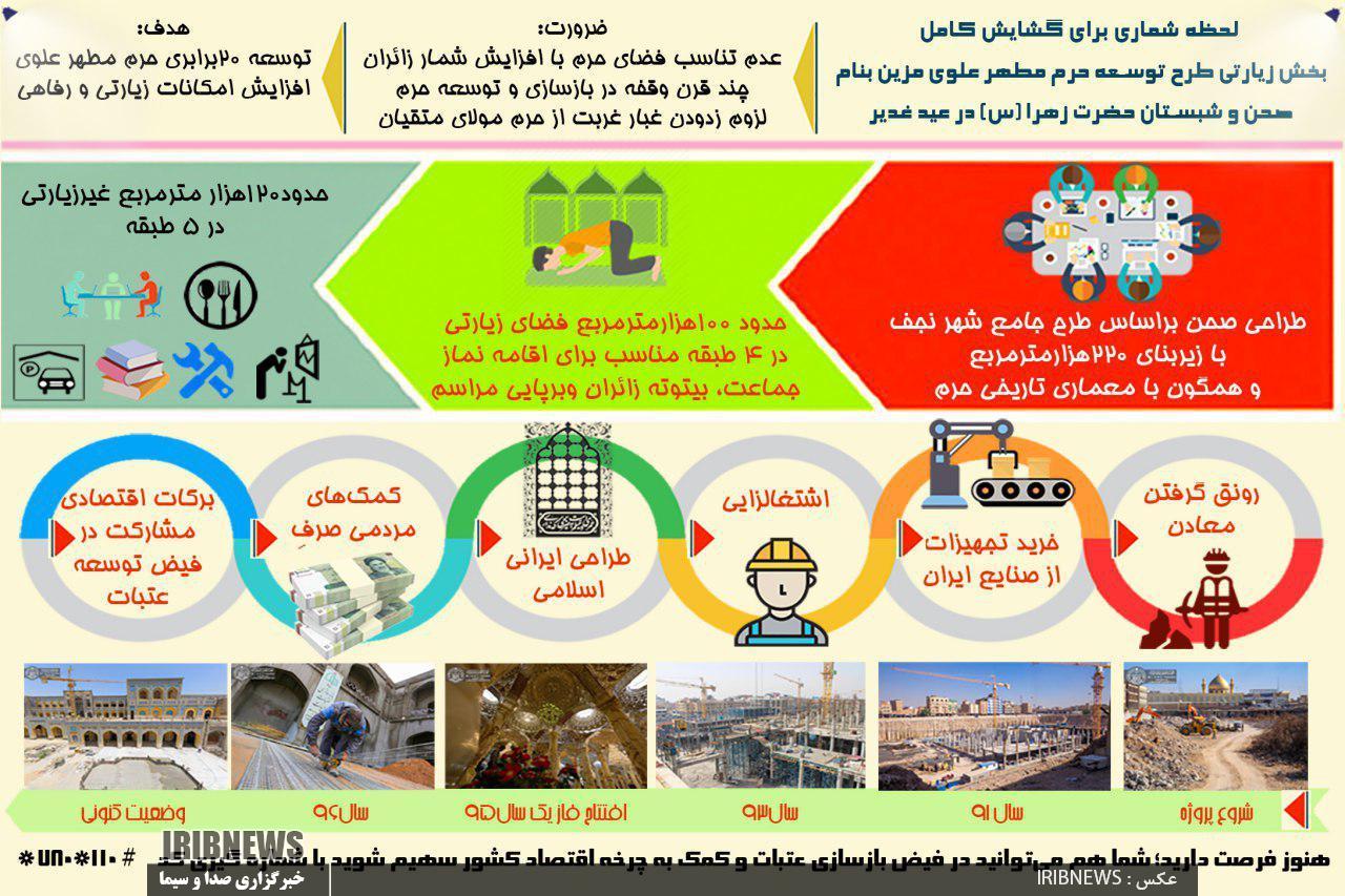 رئیس ستاد بازسازی عتبات عالیات در نجف اشرف در این باره گفت: در بخش غیر زیارتی، موزه و کتابخانه هر کدام به مساحت ۱۶ هزار و ۵۰۰ مترمربع، بخش اداری به مساحت ۱۰ هزار مترمربع و هتل به مساحت ۱۱ هزار مترمربع ساخته شده است.