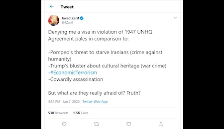 به گزارش سرویس بین الملل خبرگزاری صدا و سیما ، محمد جواد ظریف وزیر امور خارجه کشورمان دقایقی پیش با ارسال پیامی در صفحه توئیتر خود نوشت: خودداری از صدور روادید برای من با نقض توافق سال ۱۹۴۷ آمریکا در خصوص مقر سازمان ملل متحد (توافق میزبان با سازمان ملل)، در مقایسه با این موارد رنگ میبازد: -تهدید پمپئو برای گرسنگی دادن به مردم ایران (که جرم علیه بشریت است)