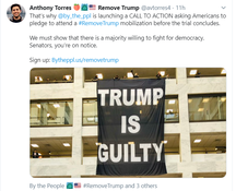 در این تجمع، معترضان یک بنر بسیار بزرگ با نوشته "ترامپ گناهکار است" را بر دیوار این ساختمان نصب کرده اند. همچنین پارچه نوشته دیگری با این پیام روی زمین گسترده شده است: "بند دو بخش چهار: رئیس جمهور، معاون رئیس جمهور و همه افسران امور غیرنظامی آمریکا در پی استیضاح ترامپ، باید برای محکومیت به خاطر فساد، رشوه و دیگر جرائم و تخلفات سطح بالا، برکنار شوند. "