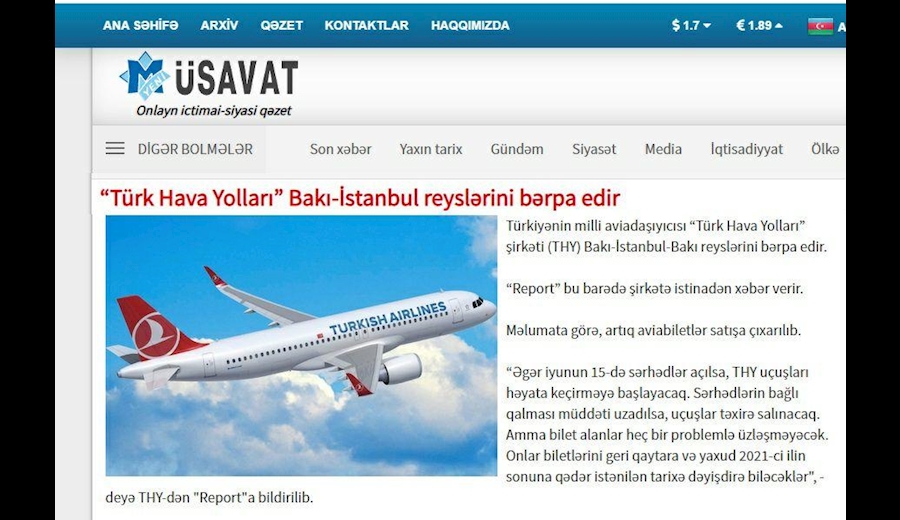 - شرکت هواپیمایی ترکیه فروش بلیط به مقصد باکو را آغاز کرد و اگر از ۱۵ ژوئن مرز‌های بازگشایی شود پرواز‌ها از استانبول به باکو انجام خواهد گرفت.