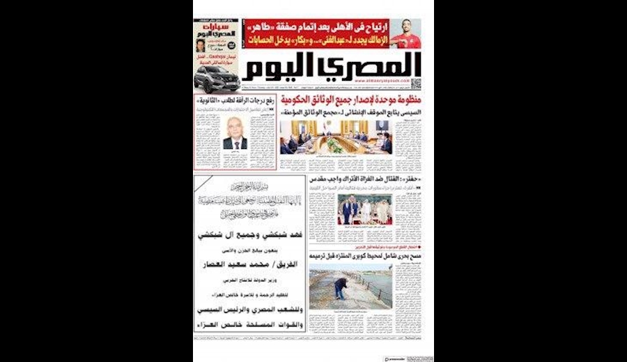 به گزارش سرویس بین الملل خبرگزاری صداوسیما‎ از قاهره، مهمترین عناوین خبری امروز روزنامه‌های مصر به شرح ذيل مي باشد.