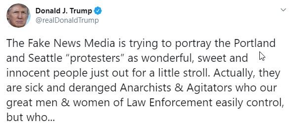 ترامپ: معترضان آنارشیست و آشوبگران بیمار و دیوانه اندبه گزارش سرویس بین الملل خبرگزاری صدا و سیما؛ ترامپ در پیام توئیتری خود نوشت: رسانه اخبار جعلی در تلاش است تا «معترضان» پورتلند و سیاتل را به عنوان مردم شگفت انگیز، ملیح و بی گناه فقط برای کمی پرسه زدن به تصویر بکشد. در واقع، آن‌ها آنارشیست‌ها و آشوبگران بیمار و دیوانه‌ای هستند که مردان و زنان بزرگ مامور اجرای قانون ما به راحتی آن‌ها را کنترل می‌کنند، اما چه کسی شهر‌های آمریکایی ما را نابود خواهد کرد و از این بدتر، اگر جو بایدن خواب آلود، دست نشانده چپگرایان پیروز شود. بازار‌ها سقوط خواهند کرد و شهر‌ها خواهند سوخت. کشور ما چنان رنج خواهد برد که هرگز تا قبل از این به خود ندیده بود. ما به زودی ویروس را شکست خواهیم داد و به عصر طلایی خواهیم رفت - بهتر از گذشته!
