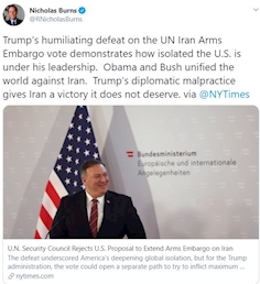 به گزارش سرویس بین الملل خبرگزاری صدا و سیما نیکلاس برنز، دیپلمات سابق آمریکایی در توئیتر نوشت: شکست خفت‌بار ترامپ در رای‌گیری شورای امنیت سازمان ملل متحد درباره تمدید تحریم تسلیحاتی ایران نشان می‌دهد که آمریکا تحت رهبری او تا چه اندازه منزوی است. اوباما و بوش جهان را ضد ایران متحد کردند. ناشی‌گری دیپلماتیک ترامپ ایران را صاحب موفقیتی می‌کند که شایسته‌ایش نیست.