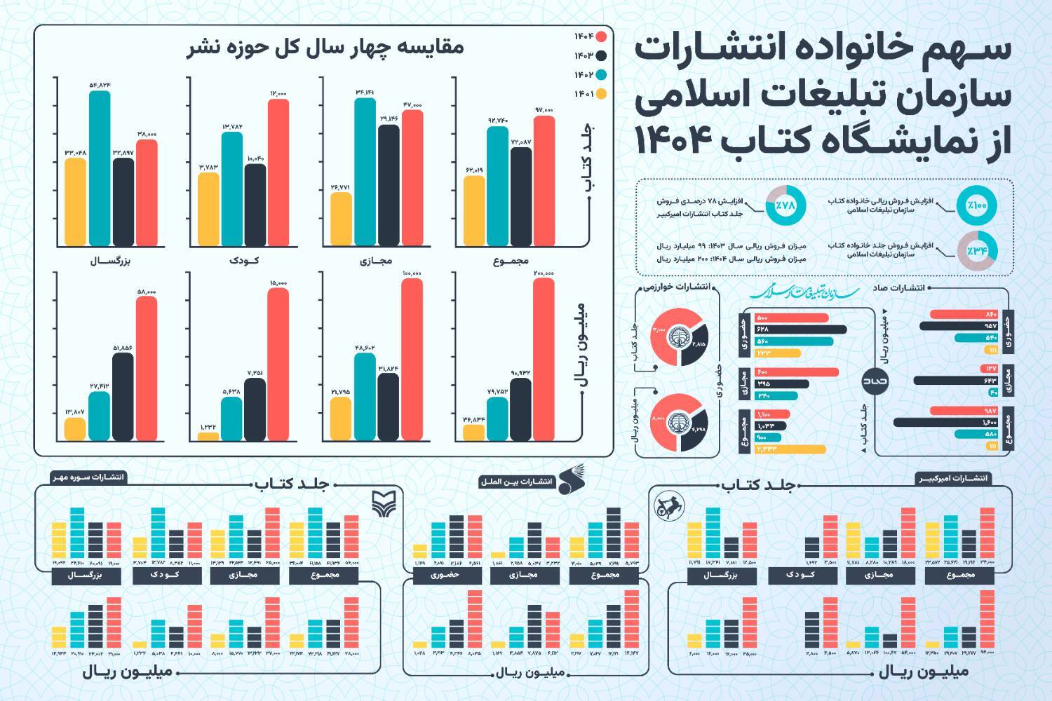 به گزارش خبرگزاری صدا و سیما، مجدالدین معلمی، مدیرعامل بنیاد کتاب، گفت:«خانواده نشر سازمان تبلیغات اسلامی در نمایشگاه کتاب ۱۴۰۴، با فروش ۹۷ هزار جلد کتاب، رشد ۳۴ درصدی در فروش تعداد جلد کتاب را نسبت به سال گذشته تجربه کرد. فروش ریالی خانواده نشر سازمان تبلیغات اسلامی نیز با رشد ۱۰۰ درصدی معادل ۲۰ میلیارد تومان بود.»