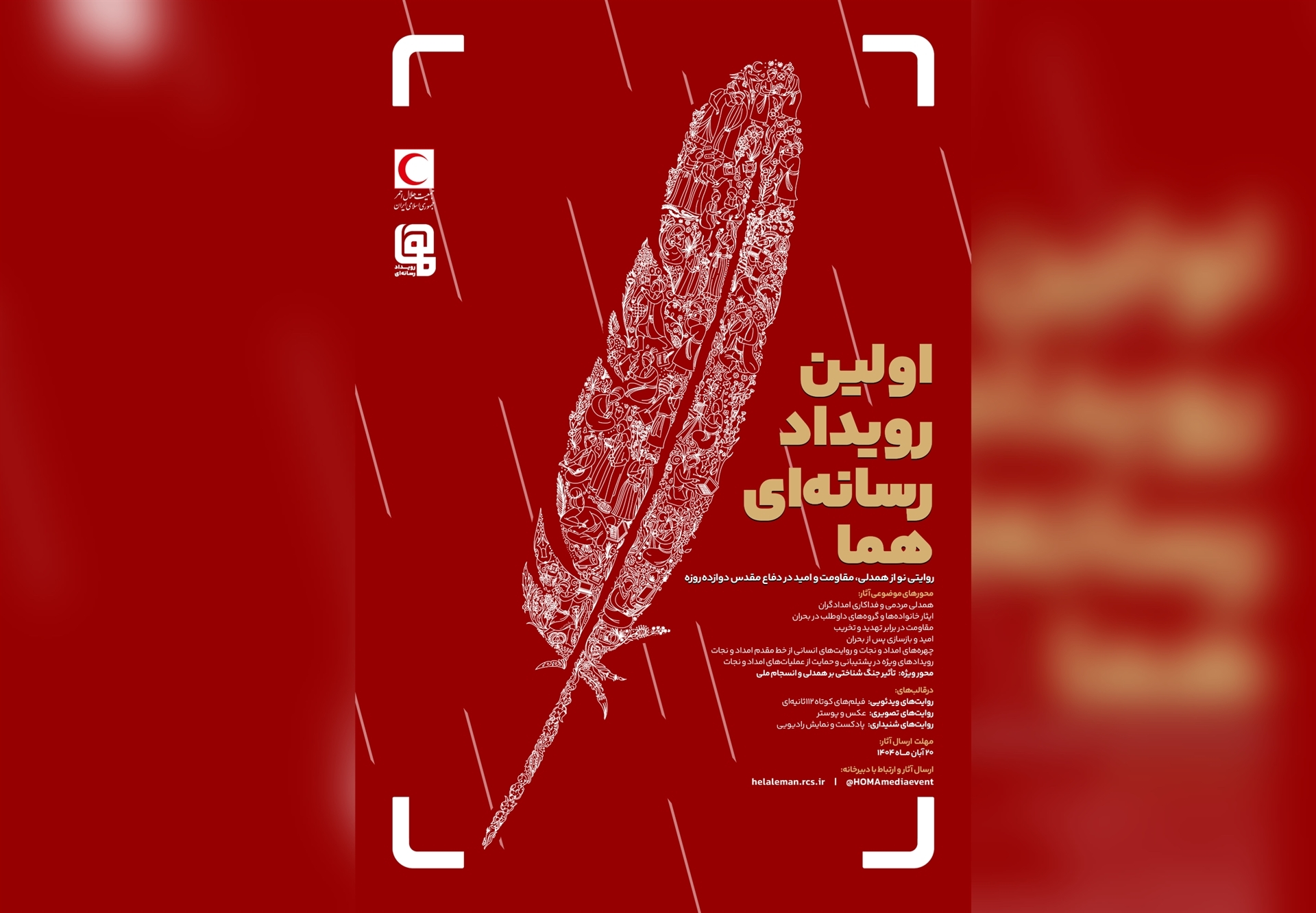وی گفت:عنوان «هُما» برگرفته از سه واژه «همدلی، مقاومت و امید» است و این رویداد در چند بخش شامل فیلم کوتاه (حداکثر ۱۱۲ ثانیه)، عکس، پوستر و پادکست برگزار می‌شود و شرکت‌کنندگان می‌توانند آثار خود را حداکثر تا ۲۰ آبان ماه ۱۴۰۴ به نشانی helaleman.rcs.ir یا صفحه مجازی @HOMAmediaevent ارسال کنند.