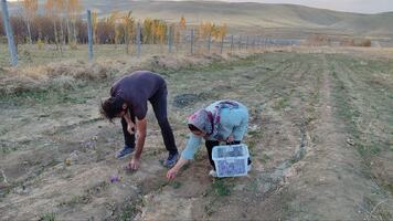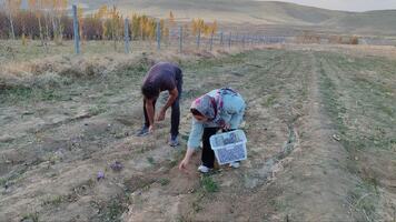 زوج مجری طرح اشتغال آفرینی کمیته امداد، برداشت زعفران را از مزرعه ۳۶۰۰ متر مربعی خود در تکاب آغاز کرده اند.
