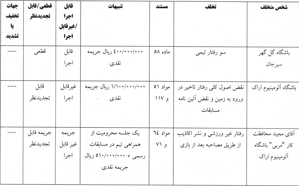 رای تخلفات محافظت کار، رجاییان، مختاری، نظری، فراهانی، بیرامی از تیم آلومینیوم و همچنین تیم گل گهر: